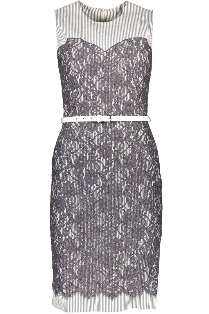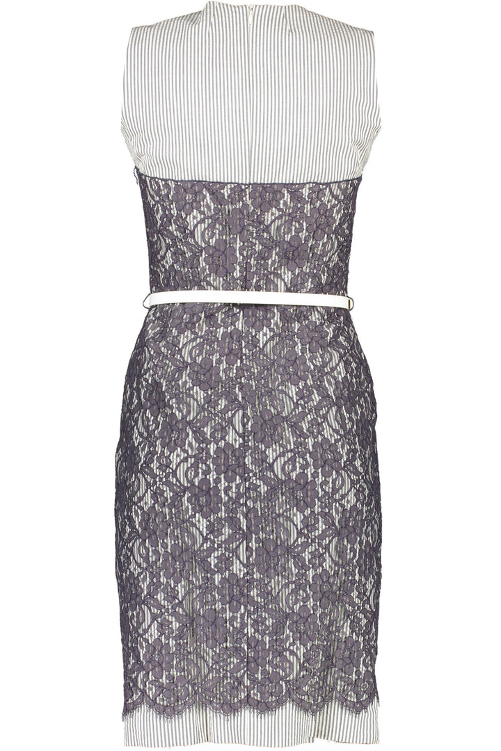 VESTIDO CURTO, OMBRO LARGO, gola redonda, padrão de renda, cós, botão de gancho e zíper, logotipo