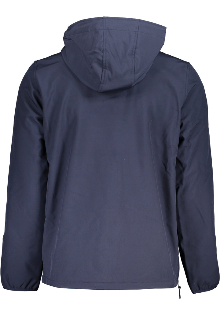 JAQUETA SOFT SHELL DE MANGA COMPRIDA COM CAPUZ, 1 BOLSO CENTRAL GRANDE COM ZIP E FECHO DE VELCRO, MEIO ZIP, ZIP LATERAL, APLICAÇÃO, LOGOTIPO