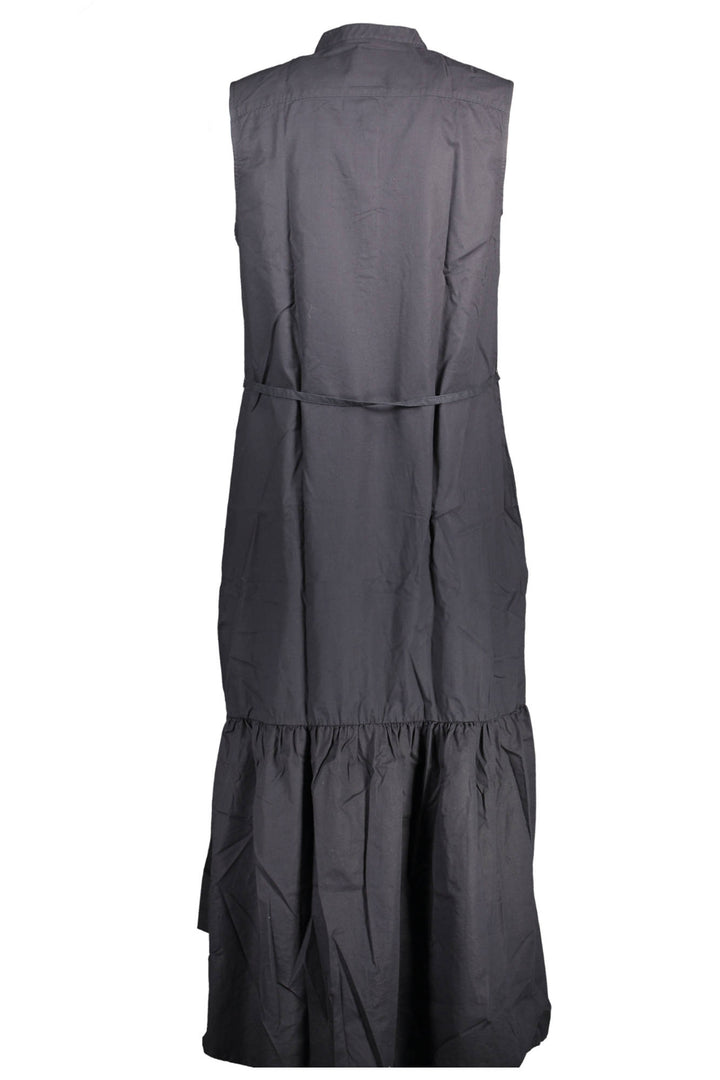 vestido longo, sem mangas, gola redonda com botões, 2 bolsos, cinto, logótipo, algodão orgânico