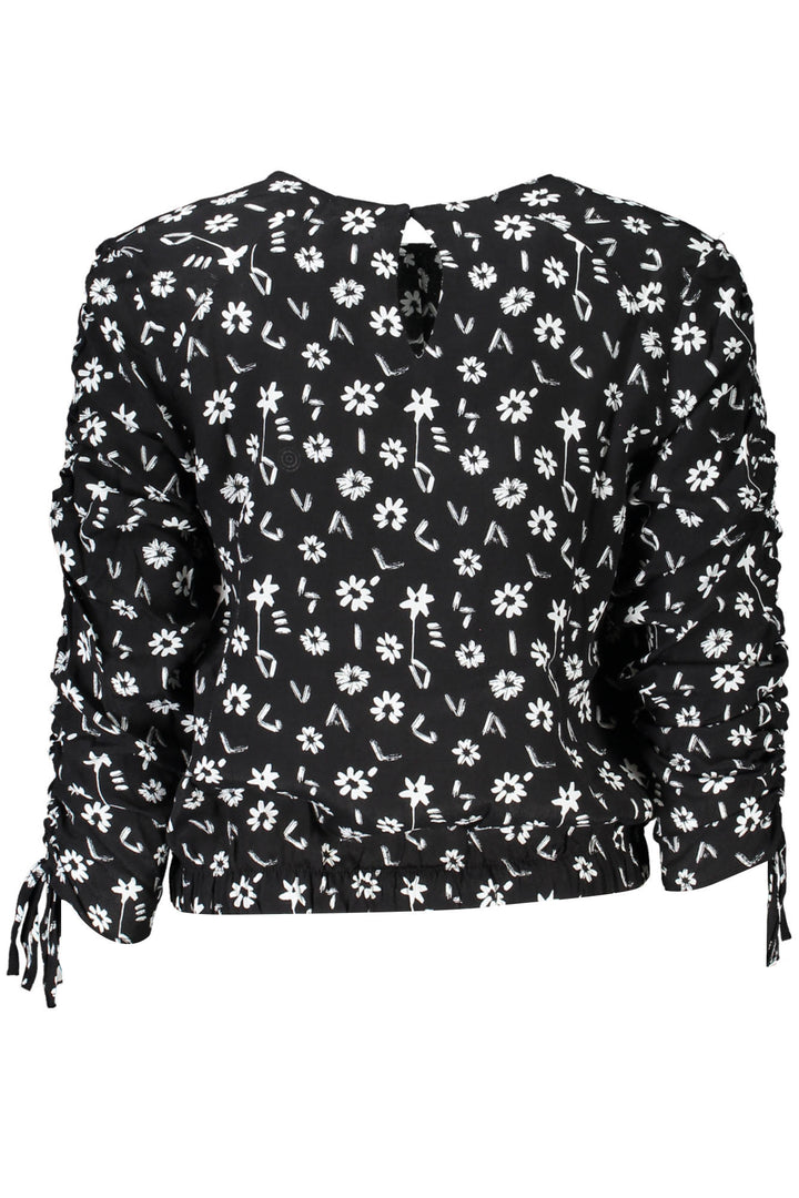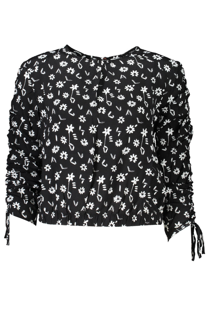 blusa de manga comprida, decote largo, punhos com atacadores, cós elástico, detalhes em contraste, logótipo