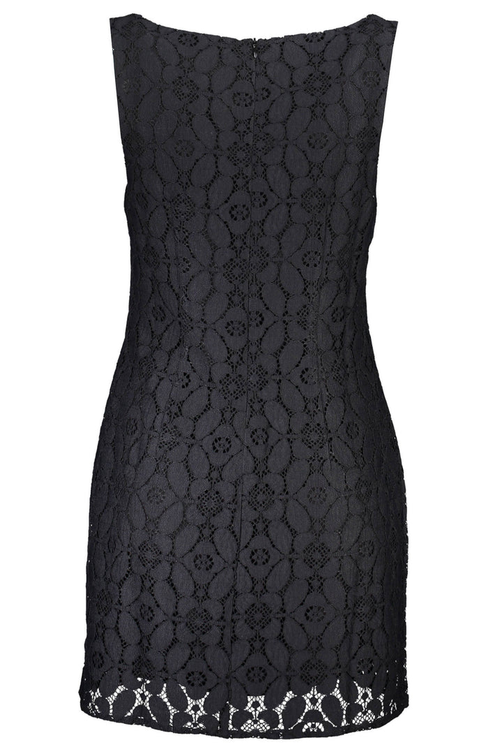 vestido curto, sem mangas, decote quadrado, zíper nas costas, forro, detalhes contrastantes, logo