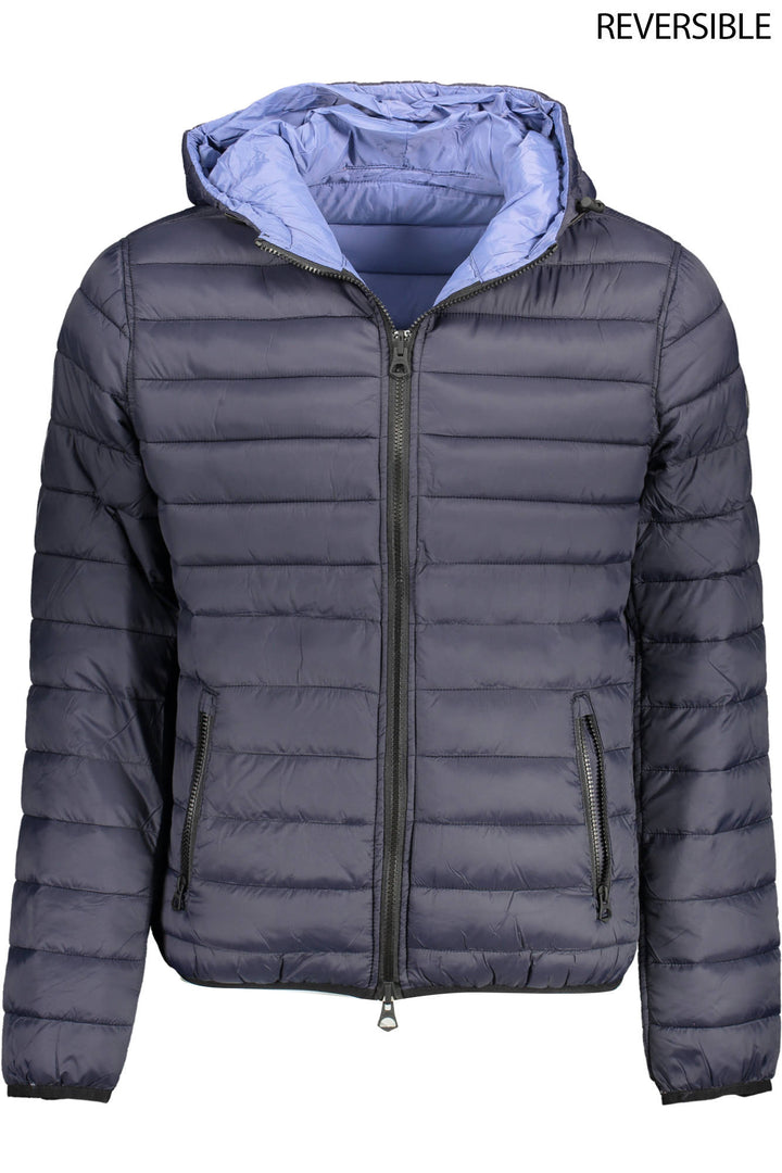 jaqueta reversível, azul marinho, 2 bolsos externos, 2 bolsos internos, zíper, aplicação, logotipo