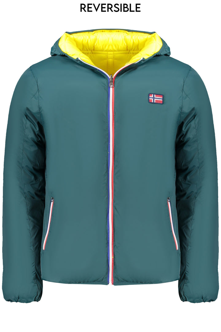 JAQUETA DE MANGA COMPRIDA COM CAPUZ, VERDE/AMARELO REVERSÍVEL, 2 BOLSOS EXTERNOS, 2 BOLSOS INTERNOS, ZIP, APLICAÇÃO, LOGOTIPO
