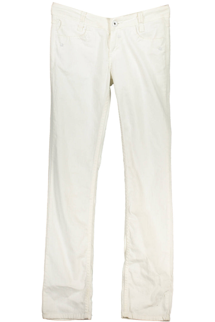 JEANS 4 BOLSOS, BOTÃO E ZIP, PERNA ESTREITA, CINTURA BAIXA, LOGOTIPO