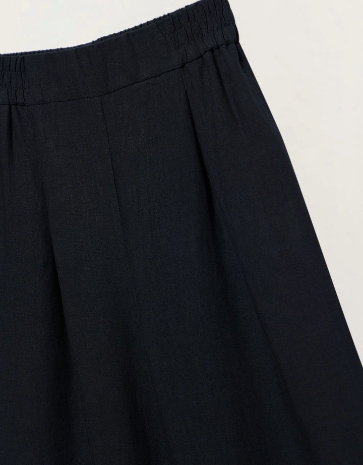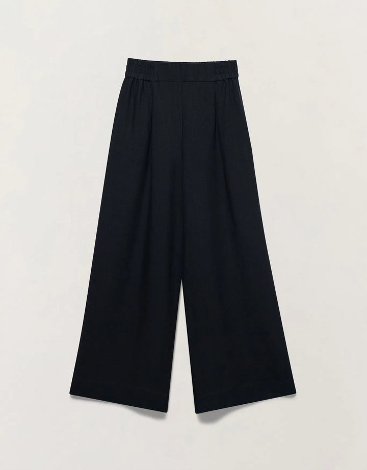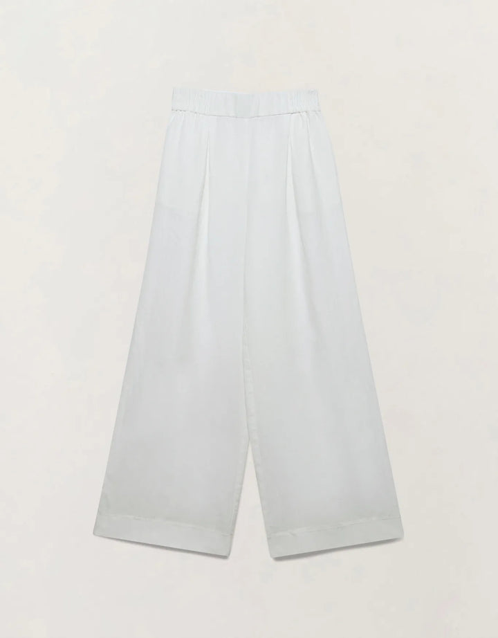 Calças pantalonas de linho, comprimento longo e cintura alta, pregas frontais, com elástico na cinta, bolsos laterais e atrás.