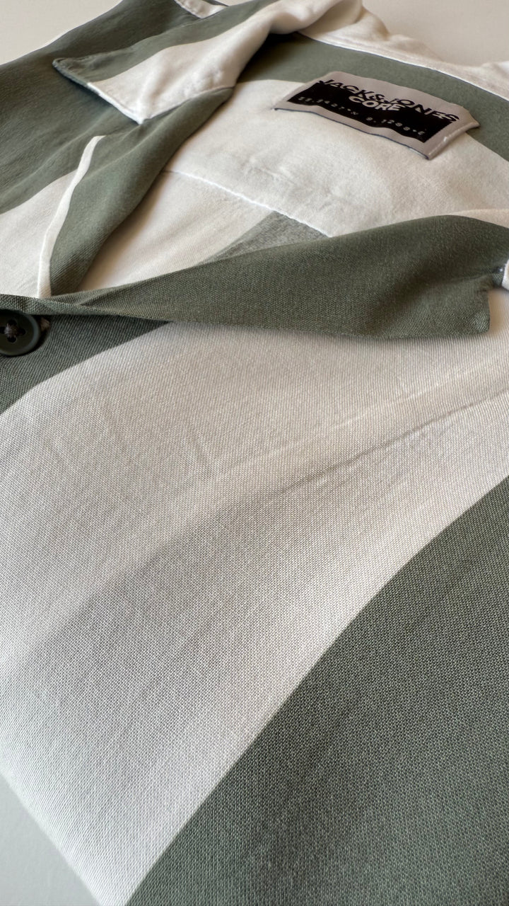 Camisa de toque suave, manga curta, modelo regular fit, fecho frontal com botões, padrão listado.