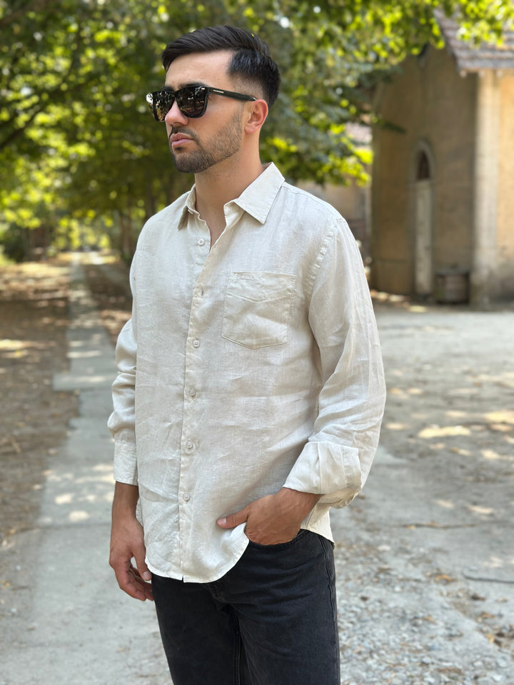 Camisa de Linho Guess bege, com bolso no lado esquerdo do peito com bordado Guess da mesma cor, camisa com punhos apertados a botões. Modelo regular fit.