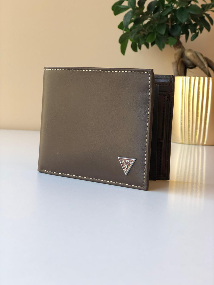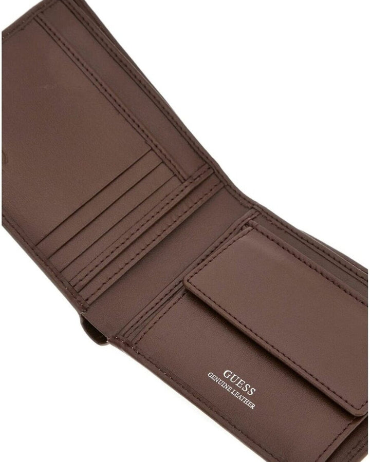 Carteira Guess castanha de Homem, compartimento para cartões e para notas, bolso com fecho de mola para moedas. Dimensões: 12x9,8x1,5 cm.