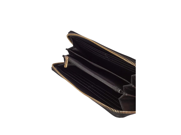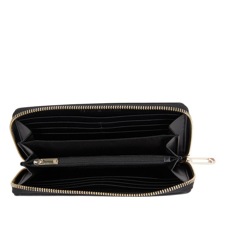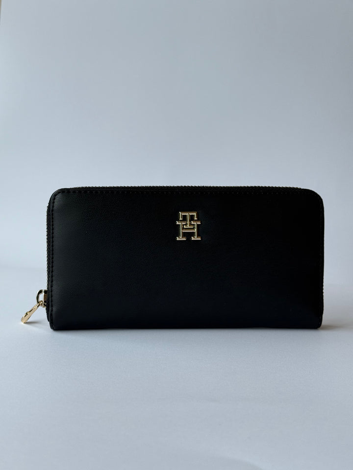 Carteira preta, com cinco compartimentos, mais um para moedas e vários compartimentos para cartões. Detalhe subtil do logótipo TH em dourado. Largura: 19cm; Altura: 10cm