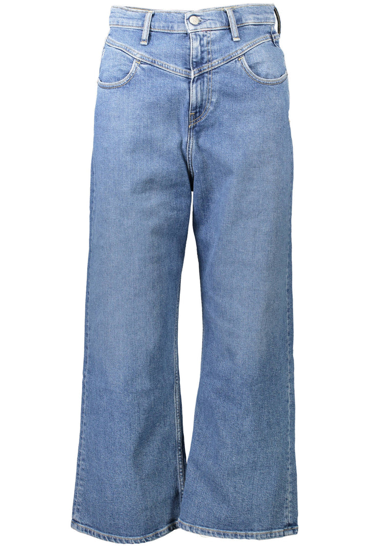 Calça jeans com 4 bolsos, cintura alta, perna larga, botão e zíper, logo