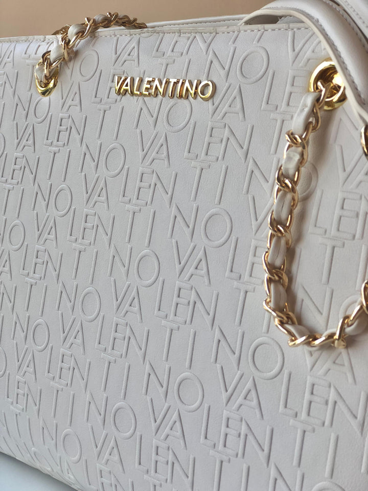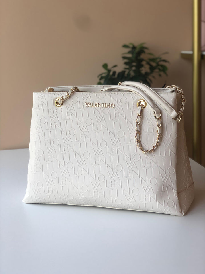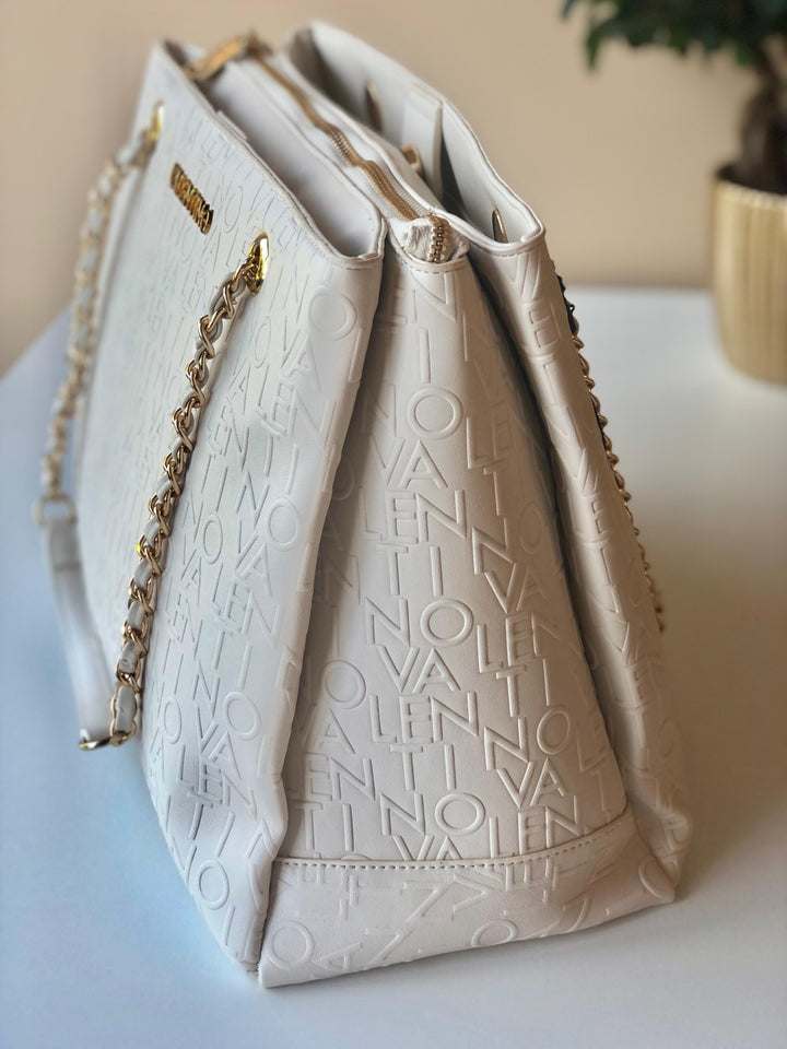 Mala de ombro bege Valentino, bem espaçosa e com três compartimentos, bolso de fecho zíper, apontamentos metálicos dourados, marca com relevo por toda a mala. Dimensões 40 x 28 x 17 cm