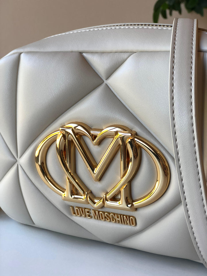 Mala Love Moschino, impressão do logotipo, compartimento principal espaçoso, compartimento interno com zíper, placa de etiqueta, fecho de correr, alça tiracolo regular.
