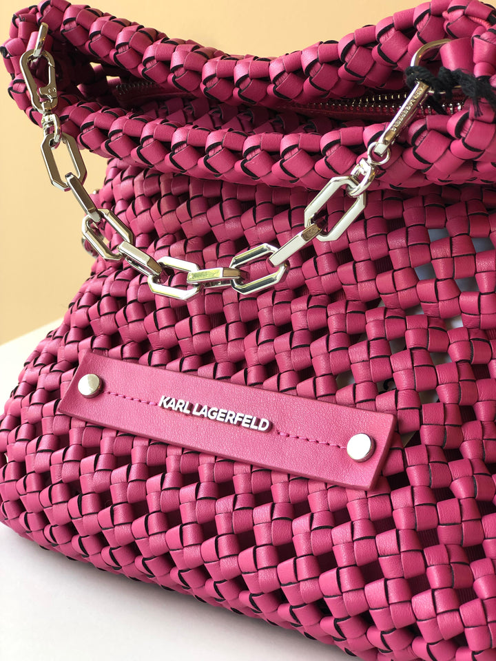 A bolsa feminina Karl Lagerfeld K/Cushion Braid Mini FD Tote na cor rosa é feita de material trançado fino. Incrivelmente chique e moderna, a bolsa K/Kushion possui alça de ombro ajustável e fecho com zíper. O logotipo da marca Karl Lagerfeld está localizado na parte frontal da bolsa. Dimensões: 23x26x8cm (largura x altura x profundidade)