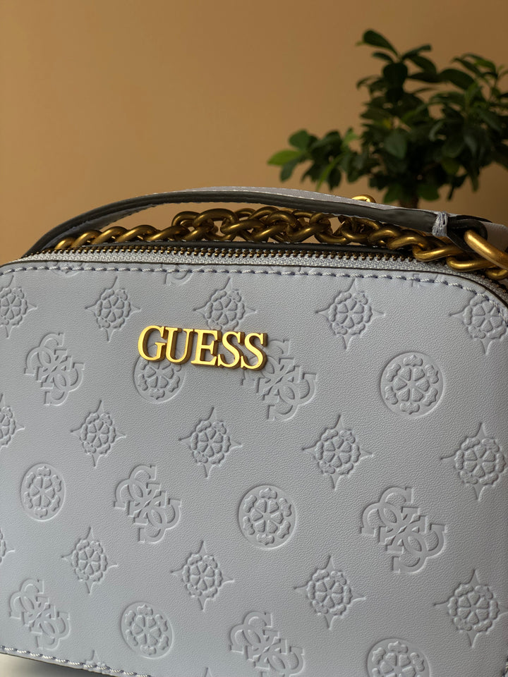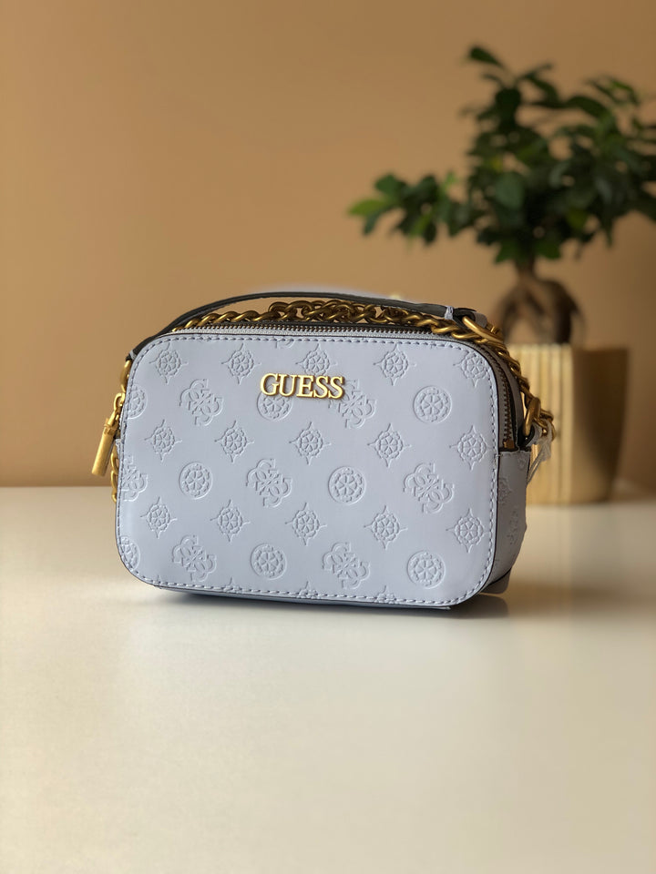 Mala tiracolo azul-bebé com lógotipos espalhados discretamente, com apontamentos dourado, dois compartimentos com fecho zip, tamanhos - comprimento: 13,5cm; largura: 20cm; profundidade: 7cm