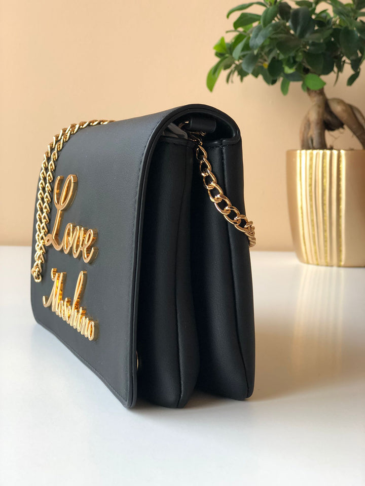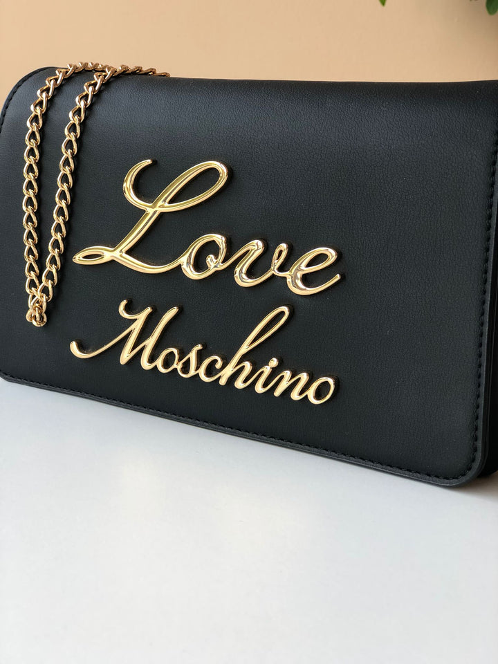 Mala Love Moschino com letras douradas e alça tiracolo, com dois compartimentos mais um bolso pequeno interno. 18x10x5cm