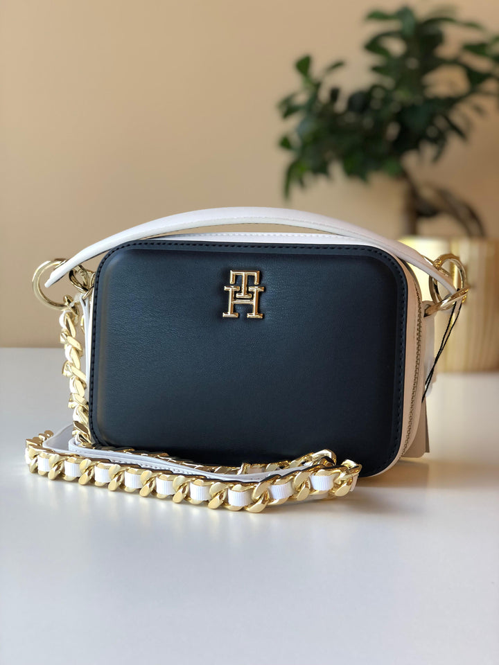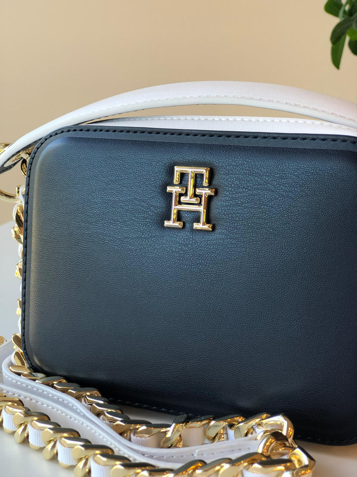 Mala Mulher Azul Marinho, Tommy Hilfiger. Mini bag, alça superior de mão e alça tiracolo, um compartimento principal, fecho Zip, dois tons (branco e azul-marinho), logo frontal TH, detalhes em corrente com dourados.