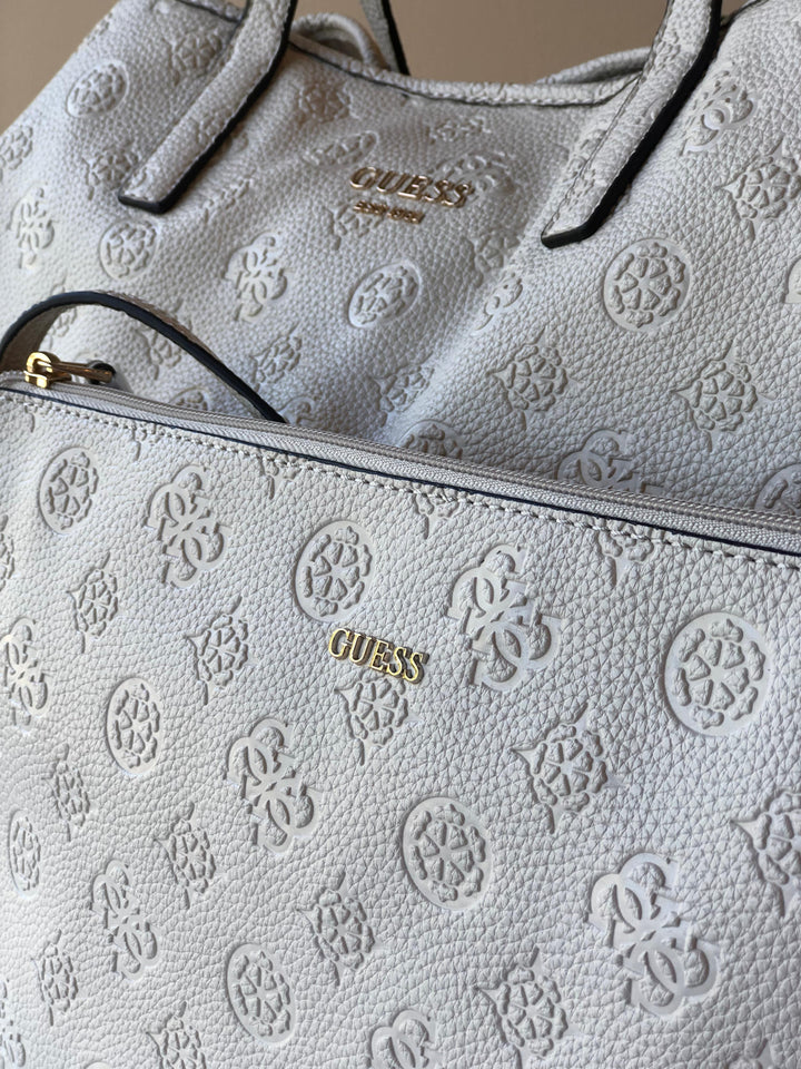 Mala Guess Tote bag com convertible pouch (duas malas numa só), compartimento único alças de diferentes tamanhos, logotipo espalhado por ambas as malas.