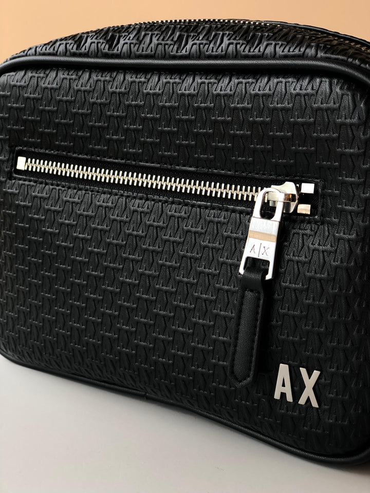 Necessaire AX preto com monograma e logótipo por toda a parte, confecionado em material resistente. O modelo possui fecho de zíper, bolso externo com zíper e alça de pulso removivel. Interior com forro do logotipo. Dimensões: 22,5 x 15,5 x 6,5 cm