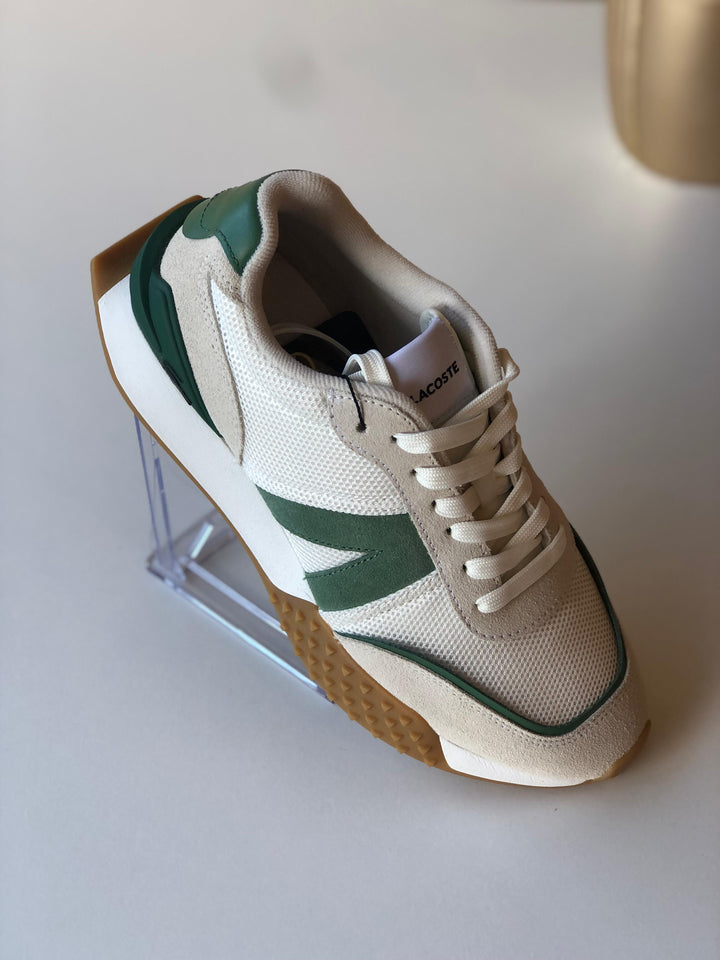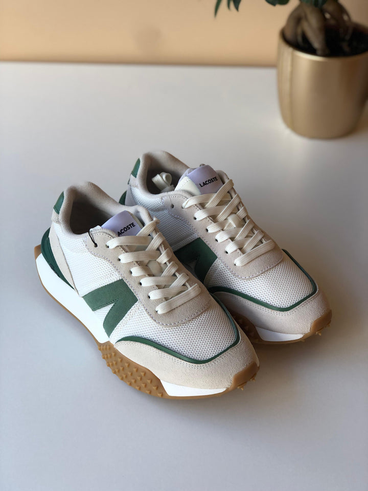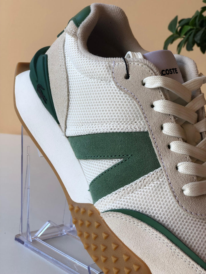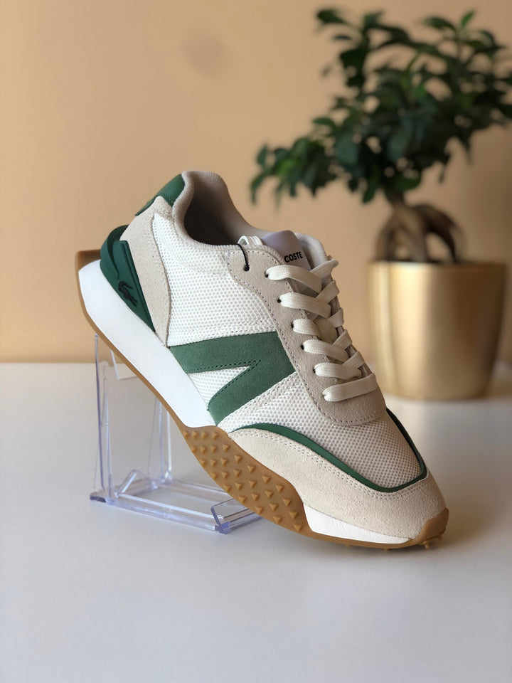 Sapatilhas Lacoste L-Spine Deluxe, design de corredor com sola texturizada, um design funcional que encontra a alta costura, forro em tecido, respirabilidade e conforto garantido, sola de borracha com extrema aderência, suporte acolchoado, crocodilo Lacoste metálico no calcanhar.