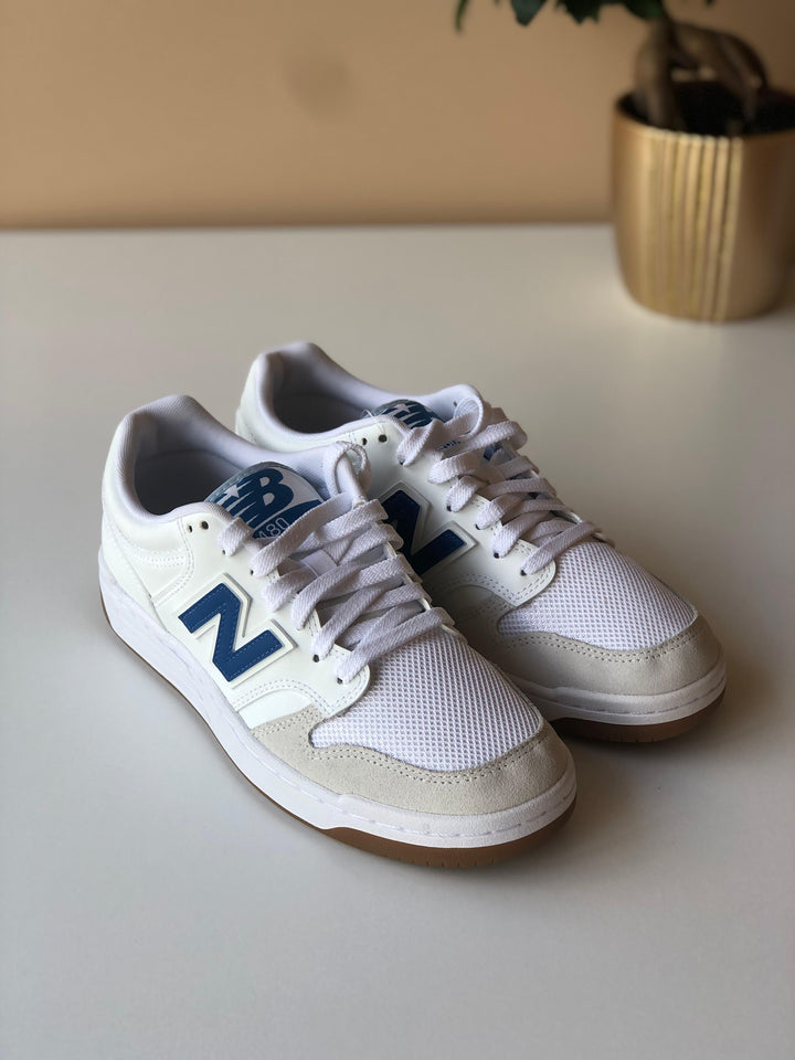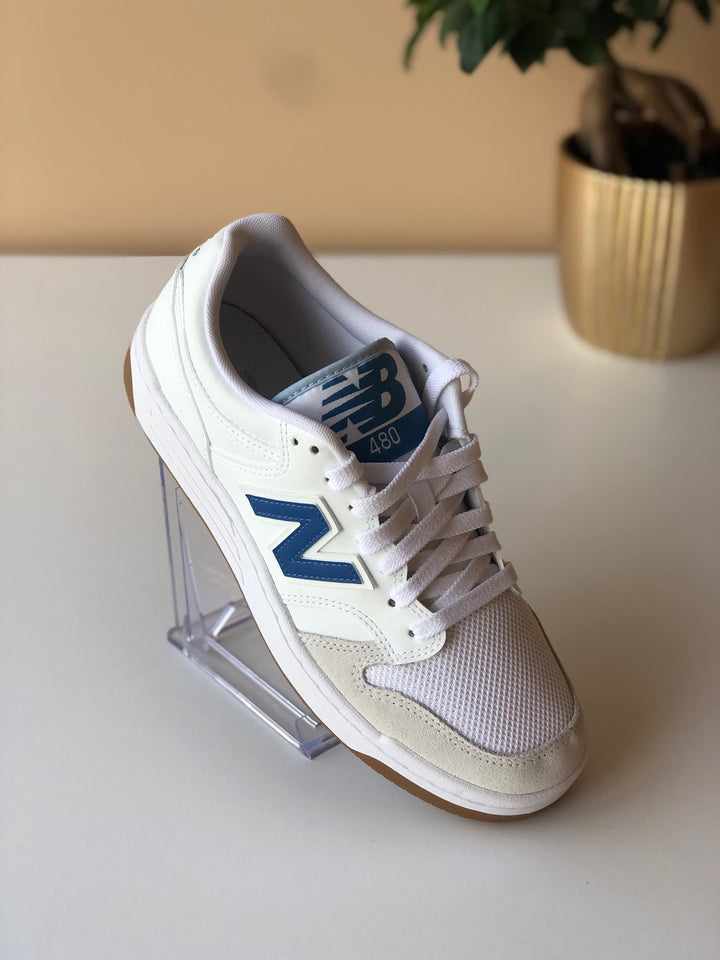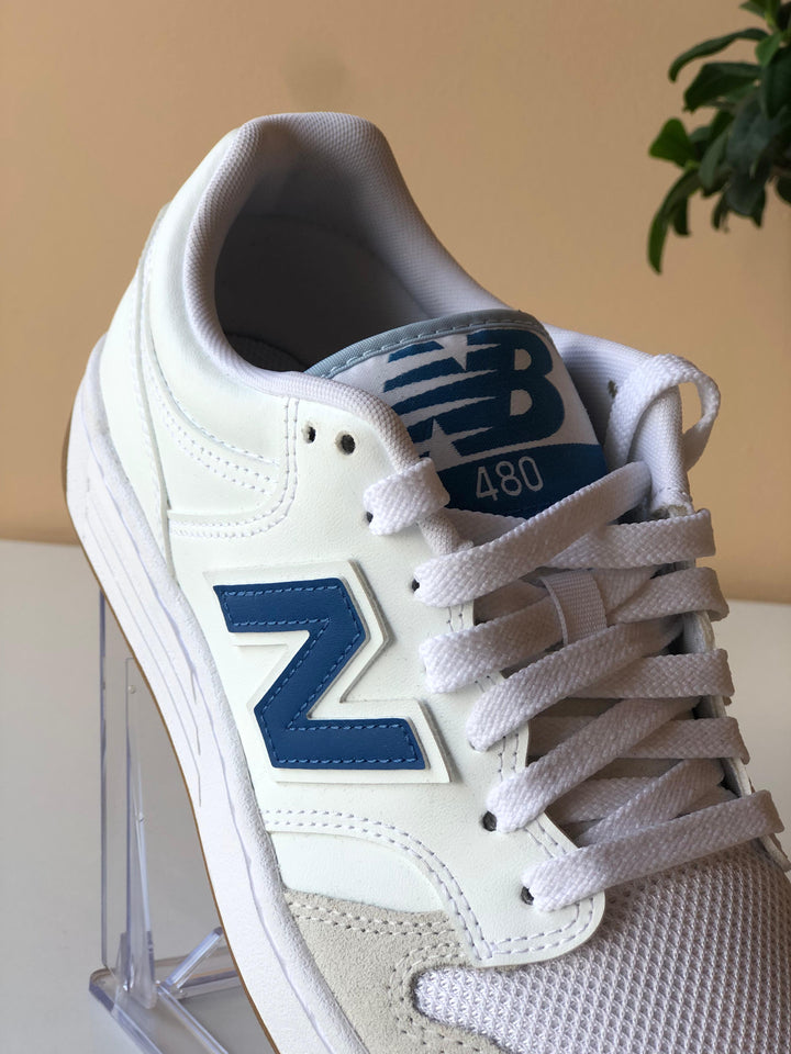 Sapatailhas New Balance modelo 430 em branco com apostamentos azuis. Aperta com atacadores, peito do pé de couro, sola de borracha, inserção OrthoLite para conforto e gestão da humidade, língua com extremidade flexível e contraforte robusto. (OrthoLite combina conforto e apoio, enquanto combate os maus odores com um tratamento com biocidas que respeita o meio ambiente e te permitirá seguir em frente, mesmo em condições mais duras).