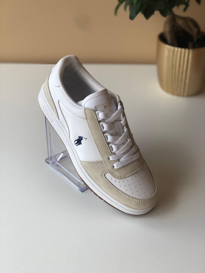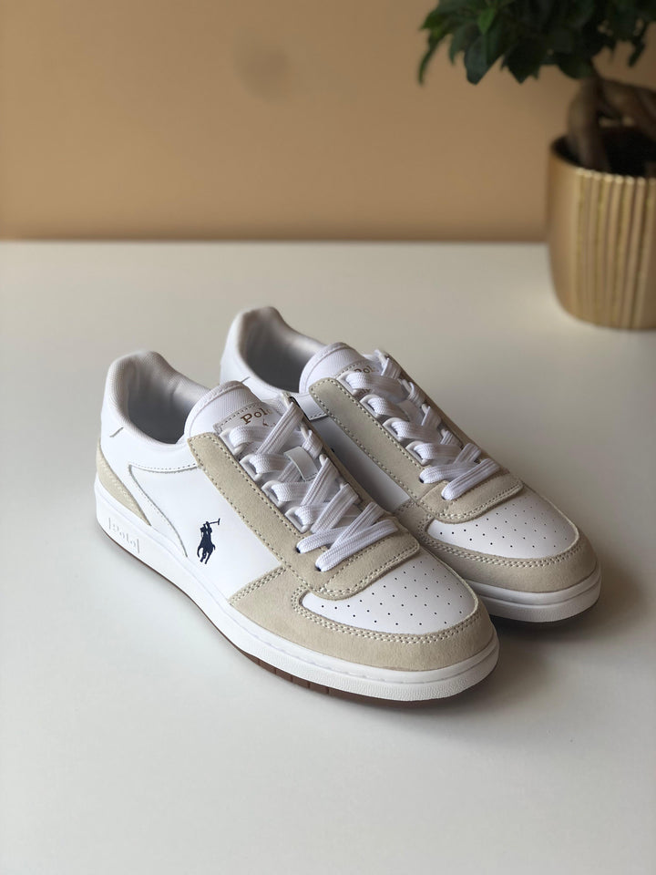 Sapatilha Polo Ralph Lauren branco de Homem, biqueira arredondada, parte da frente com atacadores., pony exclusivo bordado na parte exterior. “Polo Ralph Lauren” estampado na língua , “Polo” gravado em relevo no calcanhar. Entressola em EVA. Sola de borracha texturizada.