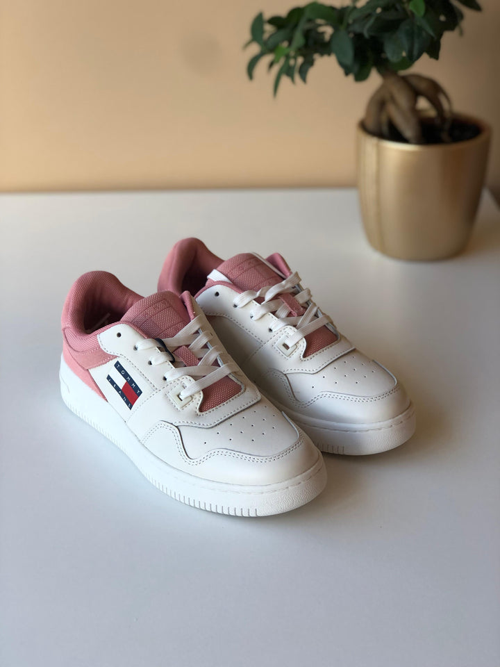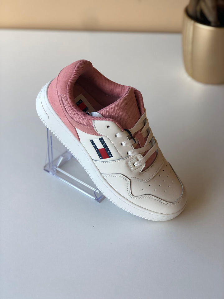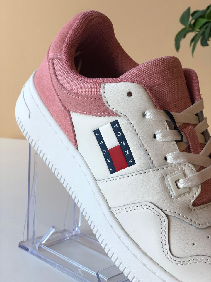 Sapatilha Tommy Jeans. Modelo Retro Basket. Cor rosa e branco. Fechamento com atacadores. Logo lateral. Sola de borracha. Detalhes em contraste.