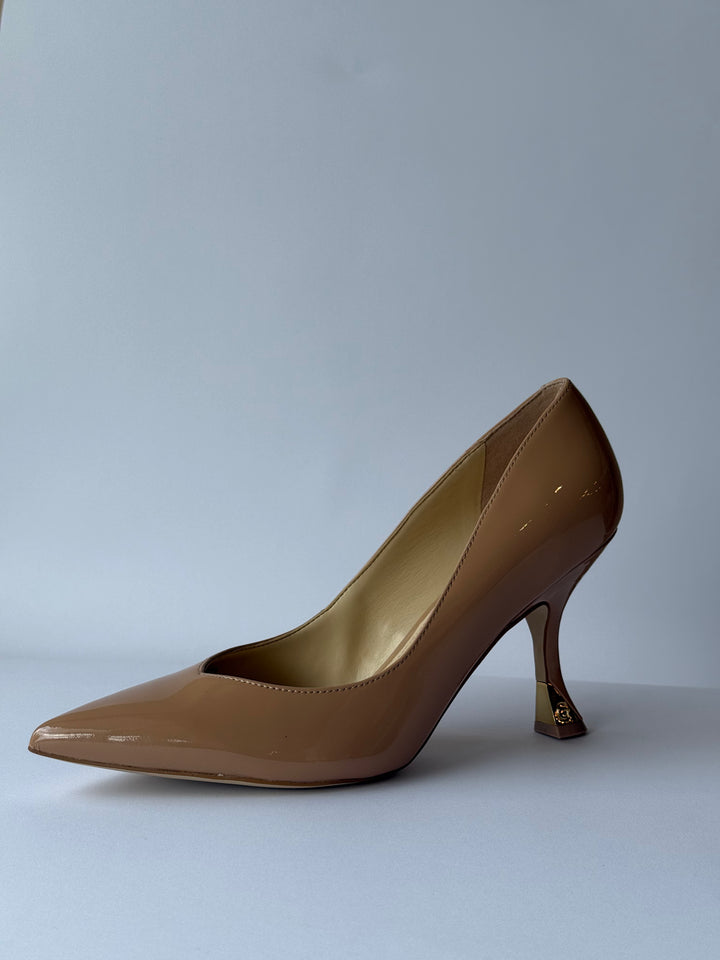 Sapato de salto alto aproximadamente 7,5cm de altura, de couro com acabamentos envernizados, pormenor do logo em dourando no salto.