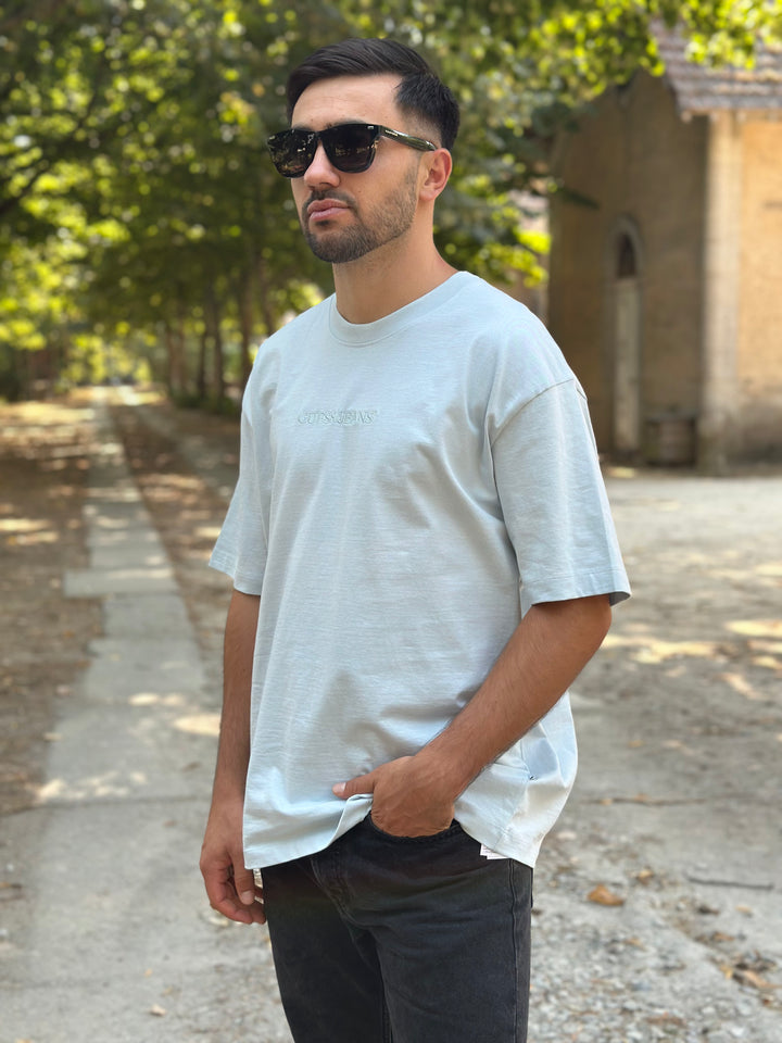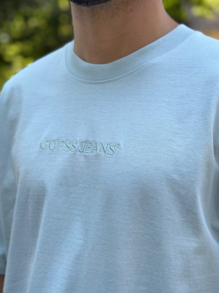 T-shirt Guess azul, com logótipo da marca bordado à mesma cor no peito. Modelo oversize