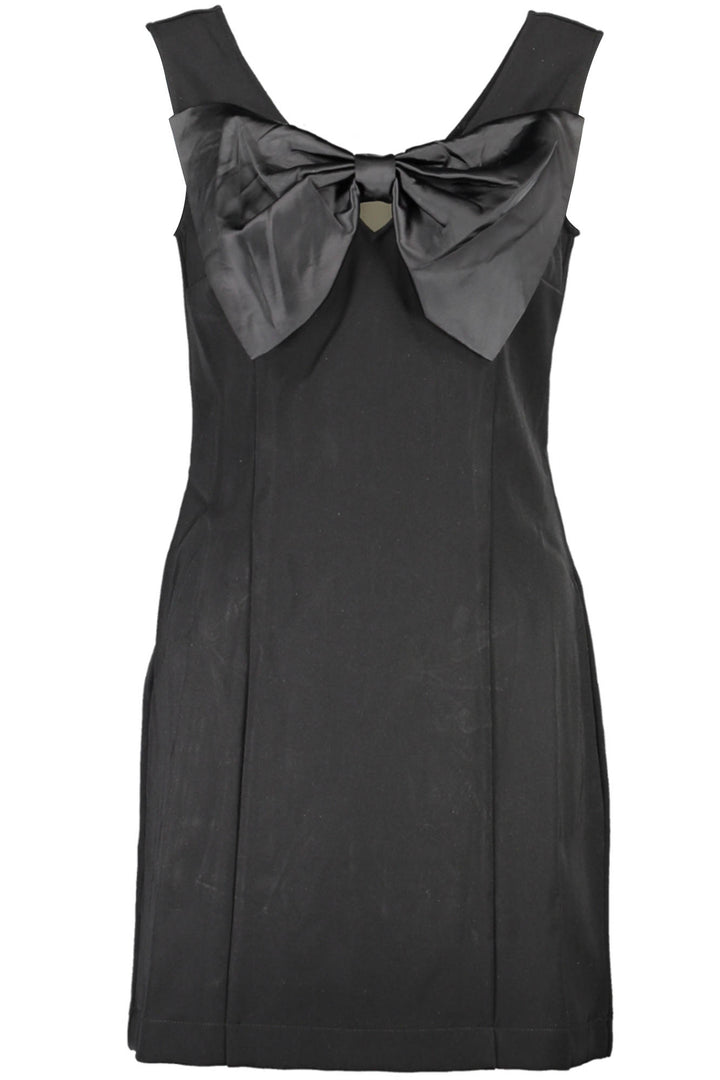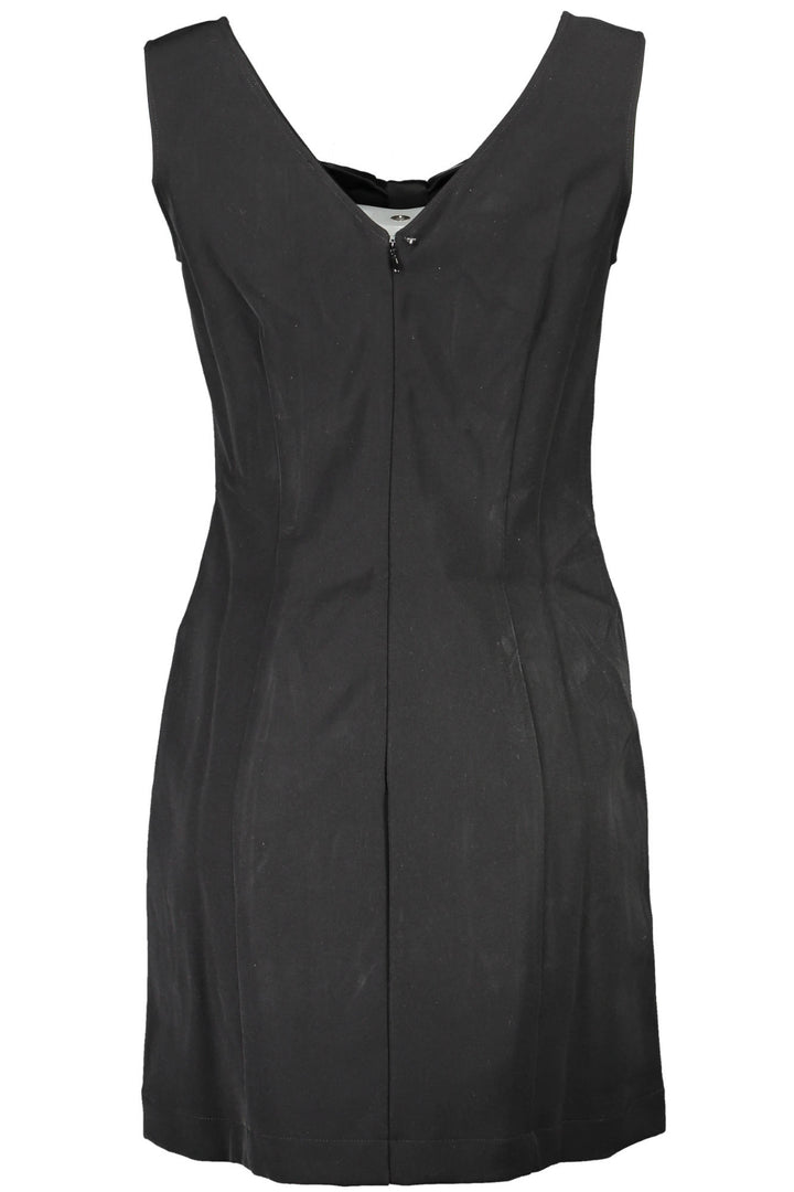 vestido curto, sem mangas, zíper nas costas, detalhes contrastantes, logo